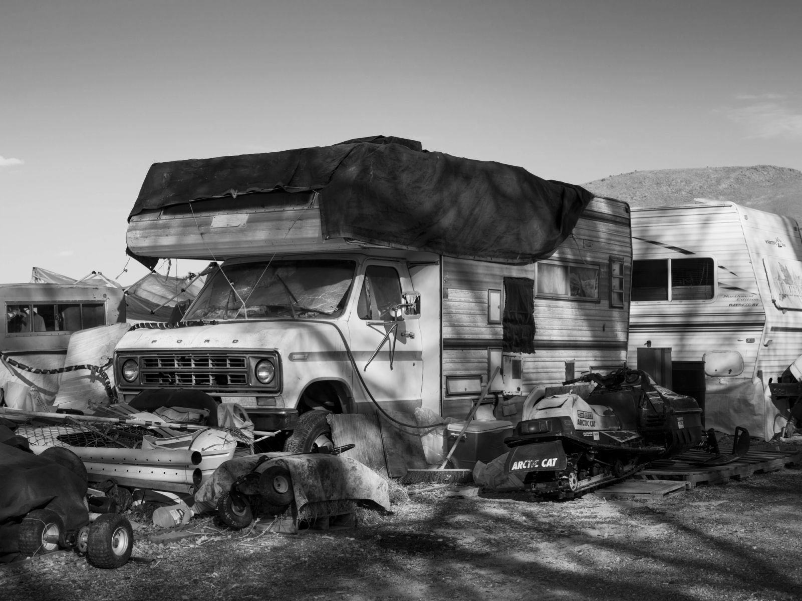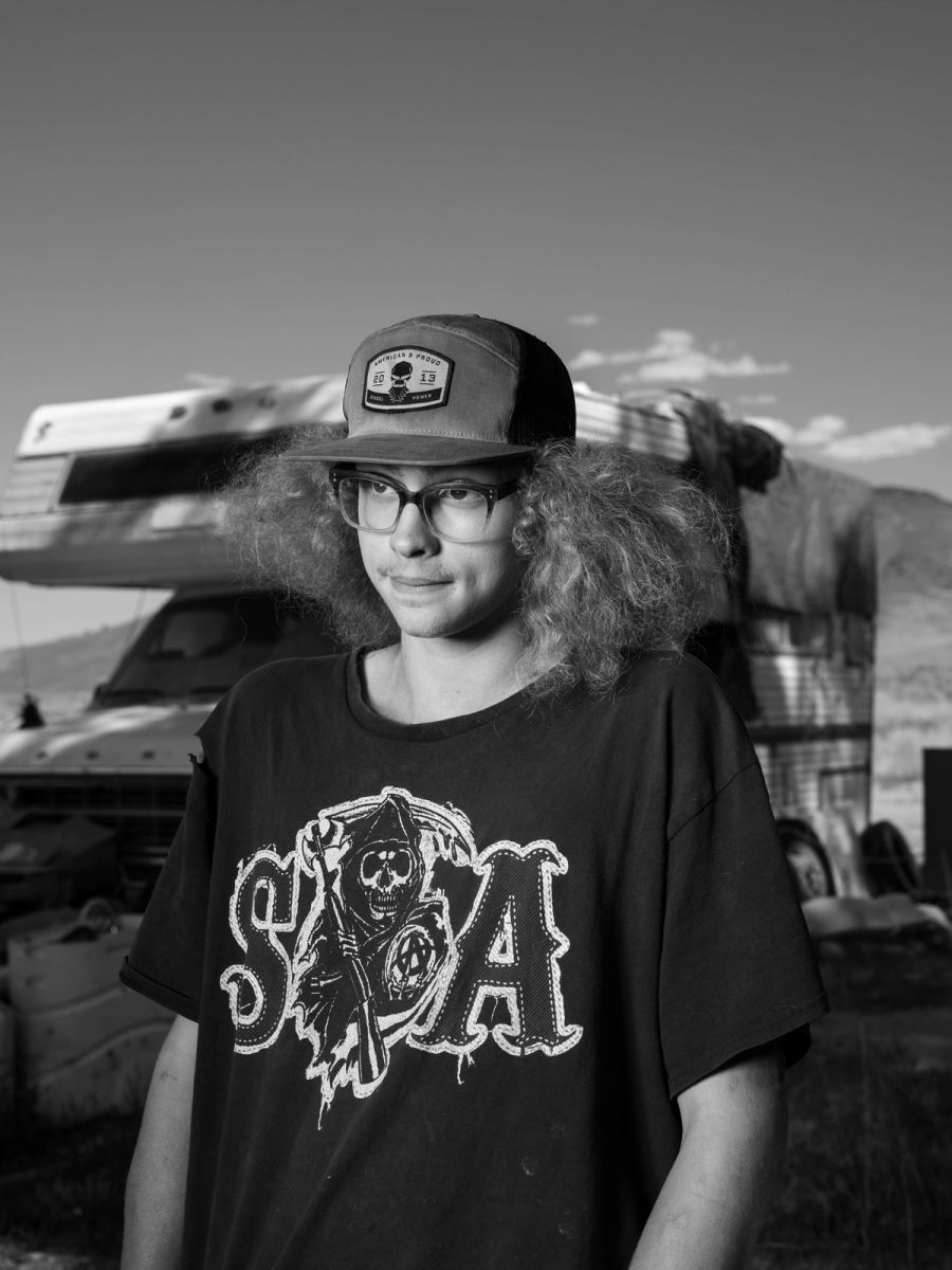 “How are you doing lately?” I ask Jeffrey, a little concerned. We are standing next to a small campervan, in which he lives with his mother, stepfather, and 14 yapping dogs. We’re surrounded by a vast area of nothing called Nevada. While Jeffrey is shooting at old microwaves with a pistol, he tells me how he, together with Kodie, his best and only friend, who also lives on this terrain, burnt down six cars and a trailer by accident, when they were lighting campfires. “We dumped it out, [thinking] it was out, and it kind of sparked everything up,” he smirks. The burnt car carcasses are now being used as a breeding ground by the peacocks that took over and roam freely here.